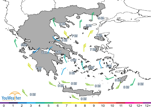 Στο Αιγαίο από B/BBA διευθύνσεις μέτριοι έως ισχυροί - στον Θερμαϊκό, στις Κυκλάδες και στο νοτιοανατολικό Αιγαίο από ΒΔ/ΔΒΔ διευθύνσεις μέτριοι έως ισχυροί.