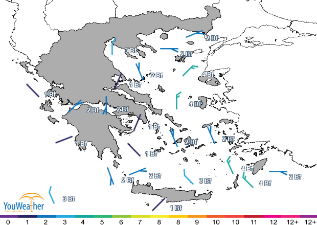 Στο Αιγαίο από B/BBΔ διευθύνσεις μέτριοι - στο Βόρειο Αιγαίο, το Μυρτώο και το δυτικό Κρητικό από μεταβλητές διευθύνσεις ασθενείς έως μέτριοι.