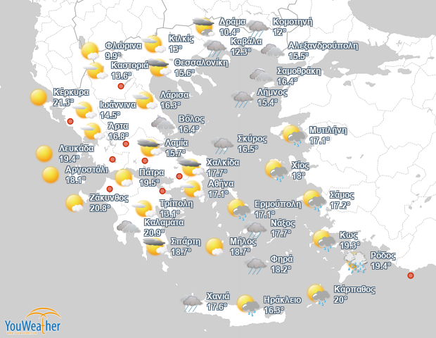 Νεφώσεις με σποραδικές βροχές σε τμήματα της ανατολικής και βόρειας ηπειρωτικής και ανατολικής και νότιας νησιωτικής χώρας - εντονότερα φαινόμενα τις πρωινές ώρες σε τμήματα της Ανατολικής Μακεδονίας, της Κεντρικής Μακεδονίας (κυρίως στο νομό Χαλκιδική και το Άγιο Όρος), της νοτιοανατολικής Θεσσαλίας, της Ανατολικής Στερεάς (κυρίως στο νομό Φθιώτιδας) και της βόρειας Εύβοιας. Σταδιακά και προς το απόγευμα τα φαινόμενα θα μετατοπιστούν σε τμήματα της ανατολικής Πελοποννήσου και των Κυκλάδων (τοπικά έντονα φαινόμενα στις δυτικής Κυκλάδες).