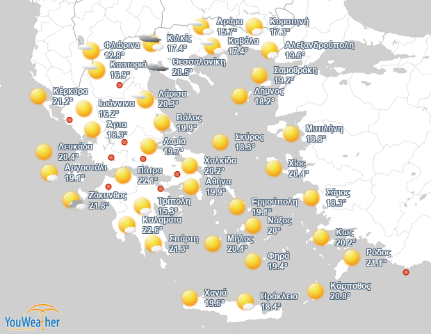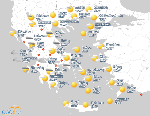 Σε μικρή περαιτέρω άνοδο και σε ελαφρώς χαμηλότερα επίπεδα από τις μέσες κλιματικές τιμές - έως 22 βαθμούς στα βόρεια, έως 24 βαθμούς στα υπόλοπα ηπειρωτικά και έως 24 βαθμούς στα νησιωτικά τμήματα.