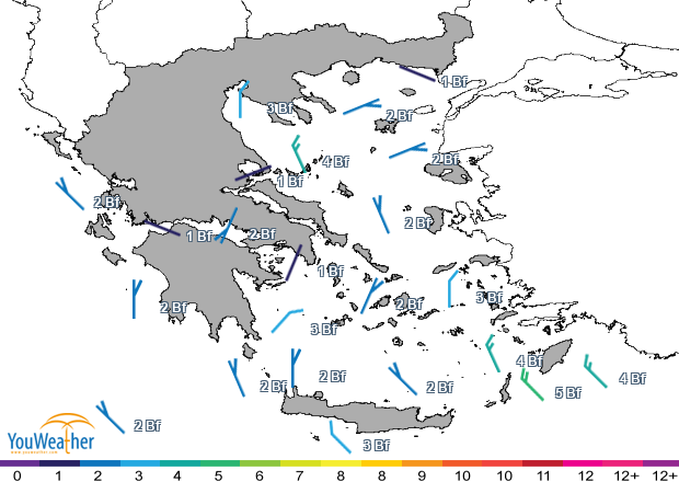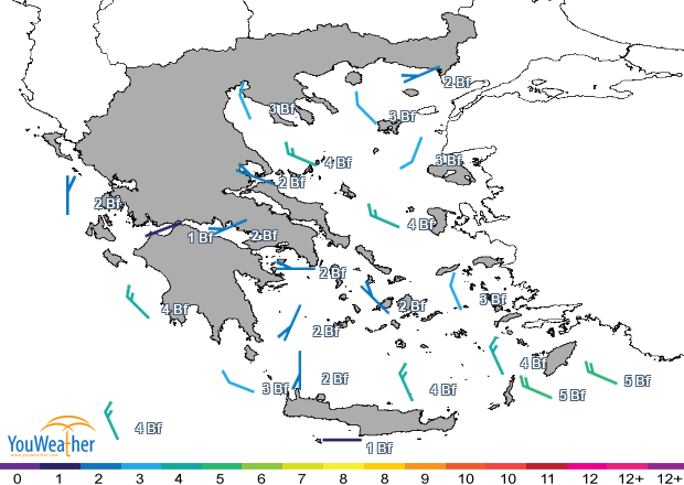 Στο Αιγαίο από B/BBA διευθύνσεις μέτριοι έως ισχυροί - στον Θερμαϊκό, στις Κυκλάδες και στο νοτιοανατολικό Αιγαίο από ΒΔ/ΔΒΔ διευθύνσεις μέτριοι έως ισχυροί.